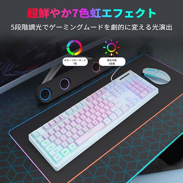 【7 色バックライト】美しい虹色に輝く静的光効果を搭載しています。暗闇でも快適にゲームプレイできる 5 段階調光機能を備えており、シーンに応じて最適な明るさに調整できます。ライトオフ機能により不要時には消灯できるため、オフィスワーク時にも配慮された設計となっています。