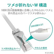 ツメ折れ防止プロテクターと屈曲に対する耐久性が高い素材のコネクターを採用したダブル構造で、ツメが折れにくいLANケーブルです。 ※1000回の屈曲検査に合格(当社検証)