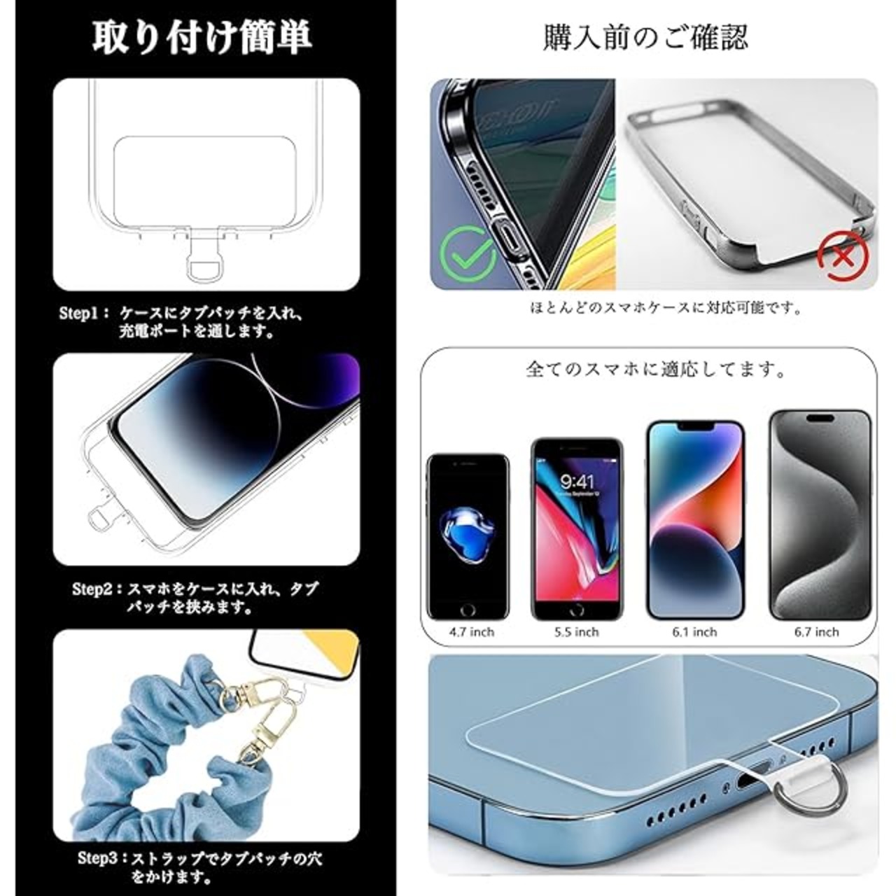 【簡単取付け】長さは約26cmで、かつ、シュシュなので伸縮性があり、ほとんどの人に適しています。 (手動測定のため、1〜2cm異なる場合があります)。タグパッチは0.6MMの超薄型をデザインされ、全機種のスマホに対応でき、ケースとスマホの間に挟んでもワイヤレス充電もでき、ケーブル充電はもちろんです。また、ショルダーストラップはフックで取り外し可能で、お手持ちのケースにはさむだけの簡単取付けできます。また、機種を問わずに使えるのでスマホを買い替えても使い続けられます!