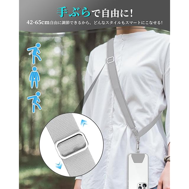 【自由な着用スタイル】スマホストラップは42cmから65cmまで調整可能なので、肩からかけるショルダーバッグ風や、胸元でぶら下げるチェストバッグ風など、お好みのスタイルでお使いいただけます。シーンに合わせて使い分けられる多機能デザインです。