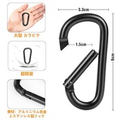 カラビナ セットはアルミ素材なので大きくて軽いので使いやすいです。コンパクトで耐久性があり、車のメッシュネット用、ザックへの小物吊り下げ用、テントロープ接続用などの色々な場面で使っています。