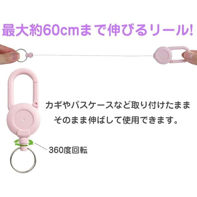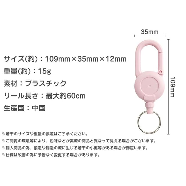 最大約60cmまで伸びるリール!<br>カギやパスケースなど取り付けたままそのまま伸ばして使用できます。<br><br>大きな開口部のシンプルなカラビナで着脱カンタン!<br><br>パステル調のカラフルなカラーでお手持ちのバッグやカバンに合わせてお選びいただけます。<br><br>サイズ(約):109mm×35mm×12mm<br>重量(約):15g<br>素材:プラスチック<br>リール長さ:最大約60cm<br>生産国:中国<br><br>※若干のサイズや重量の誤差はご了承ください。<br>※ご閲覧の環境等により、色味などが実際の商品と異なって見える場合がございます。<br>※輸入商品の為、製造や輸送の際に生じる若干の小傷等がある場合が御座います。<br>※仕様は改善の為に予告なく変更する場合があります。