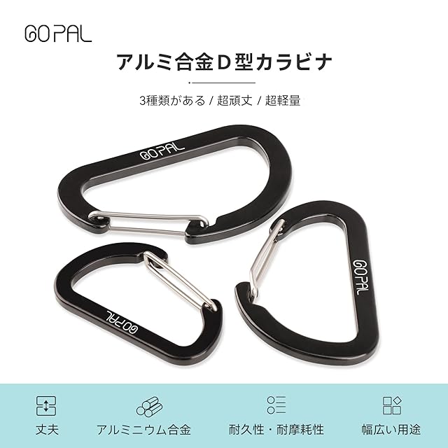 <p>Go Pal GP02 アルミカラビナ 小型 おしゃれ カラビナ アウトドア 登山 釣り キャンプ ポーチ ブラック 7cm 8個入り</p>【製品仕様】サイズ:約70mm*45mm,開口幅:1.5mm,重量:13g/個,素材:6061アルミニウム&SUS304ステンレス鋼、軽量、高耐食、高耐摩耗、高硬度などの特性を持っていますが、長持ちです,フレーム部分は一体成型により、表面はなめらかで,使い心地抜群です,錆びないので長持ちです。汚れがあっても水で洗うだけど簡単に取れます。< br >【最大安全強度】約40kg(縦軸方向)強度範囲以内でご使用ください。このカラビナは登山用ではございません。(クライミング&登山専用釦として利用できません、予めご承知ください)< br >【用途】カラビナ セットはアルミ素材なので小さくて軽いので使いやすいです。コンパクトで耐久性があり、車のメッシュネット用、ザックへの小物吊り下げ用、テントロープ接続用などの色々な場面で使っています。アウトドア活動、キャンプ、釣り、ハイキング、バックパック、キーチェーン、ペットのブランコ、犬のリードのアクセサリー、釣り道具、ウォーターボトル、ポーチ、キーホルダーなどの場合に対応できます。< br >【質感高い】カラビナの表面は滑らかで光沢があり、着色も均一です。長期間使用しても塗装が剥がれません。質感高いロックカラビナです。< br >【ご注意】重いものをぶら下げた場合は、取扱説明書をよく参照してください。実際に受けた重力は、受力方向の違いによって違いますので、ご注意ください。