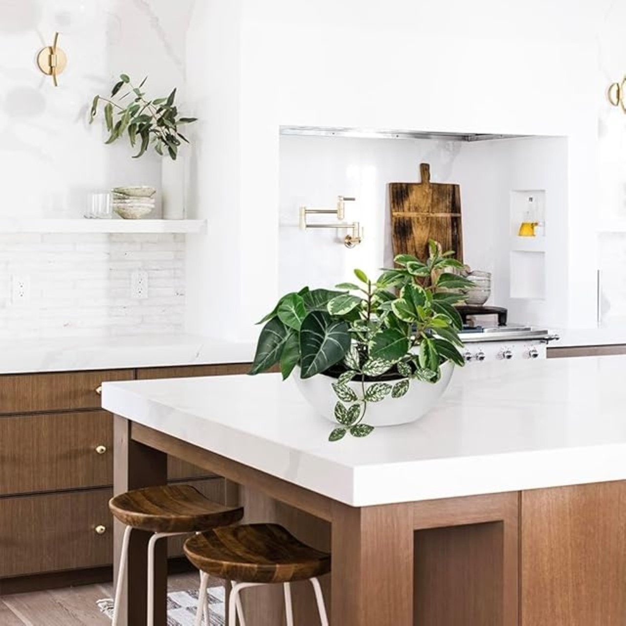 【洗練されたデザイン】ゴムの木、クワズイモ、ポトスの3種の葉がそれぞれ異なる形や色合いで美しく再現されており、自然の中にいるようなリアルな感覚を提供します。船形の白いプラスチック鉢は、優雅でモダンな印象を持ち、インテリアに調和します。滑らかなカーブが植物の緑を引き立て、清潔感とスタイリッシュな雰囲気を演出します。
