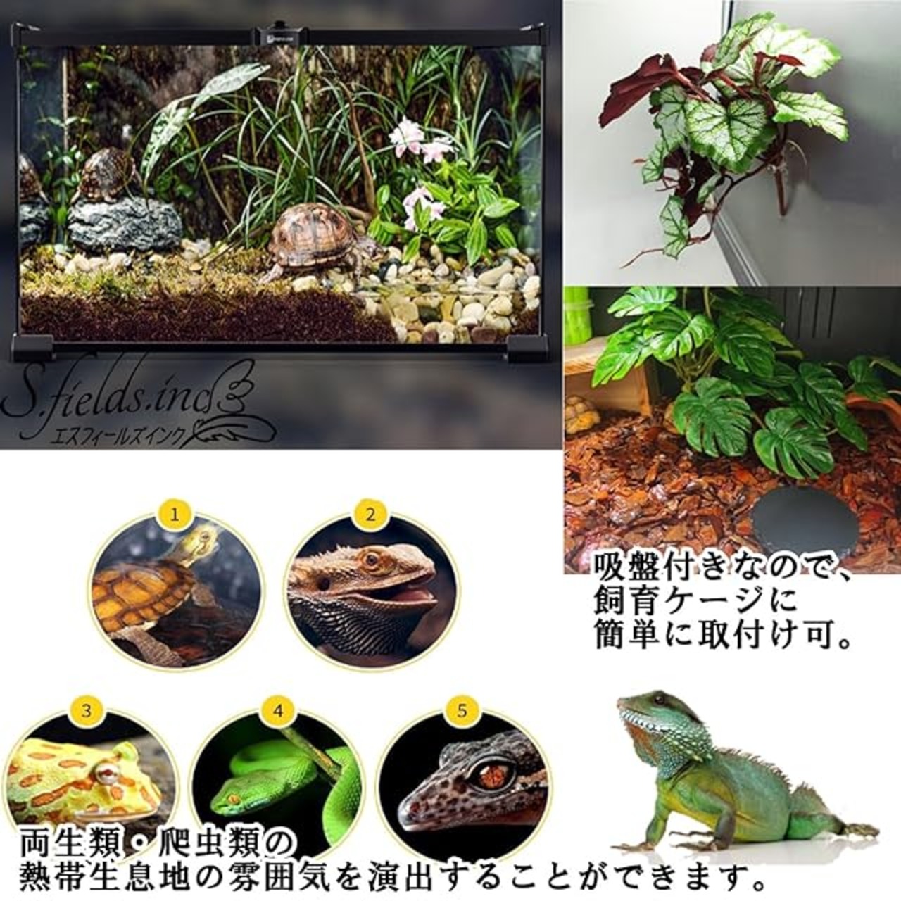 亀、イグアナ、トカゲ、ヤモリ、カエル、ヘビ、カメレオン、ヤドカリなどの熱帯生息地の雰囲気を演出することができます。