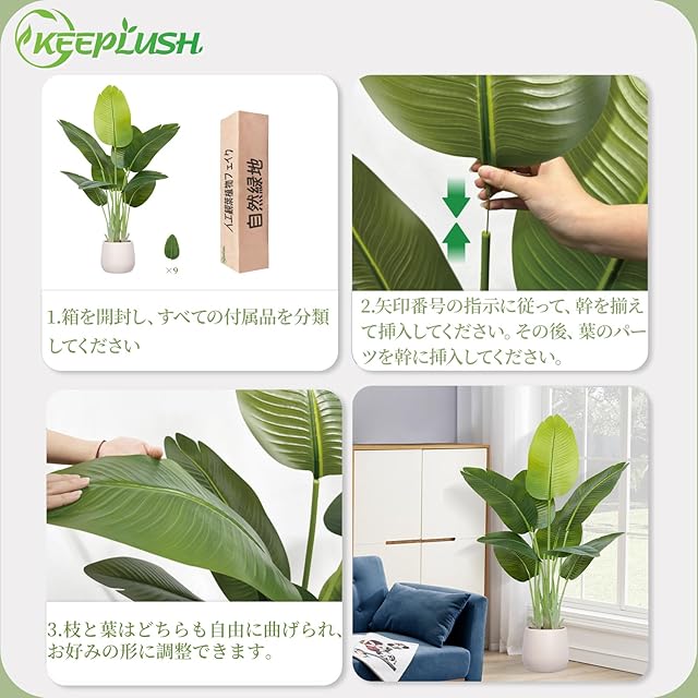 【安心の品質と1年】100%環境にやさしく、刺激の少ない素材を使用し、国際的な安全規格を取得しているため、あなたやご家族への危険性はゼロです。Keeplushの組み立ては簡単なステップで、工具を使わずに完成させることができます。組み立て時は、最も大きな葉を最上部に挿すことで、より自然で美しい仕上がりになります。箱から出してすぐにトロピカルな風味を楽しむことができます。Keeplushは特別に12ヶ月の長期サービスを提供しており、専門のアフターセールスチームがいつでも対応いたします。素材から職人技まで、細部に至るまで品質にこだわり、365日色あせることのない緑の美学をお楽しみいただけます!