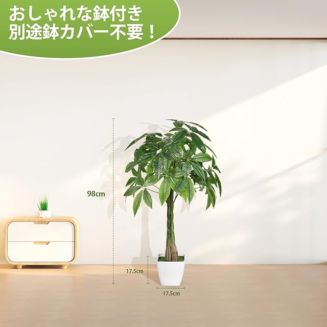 リアルな質感と丈夫な作り: 全体の高さは約98cm、重さ約2.4kg。パキラの人工観葉植物は上質なフェイクシルク素材を採用し、本物のような艶やかで柔らかな手触りを実現。葉や幹にはワイヤーが内蔵されており、落葉せず、長く美しい姿を保ちます。