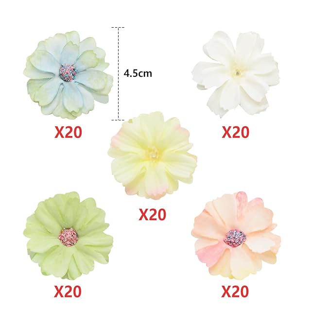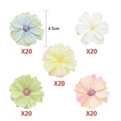 【セット内容】造花パーツ5色100個セット。セット内容:5色20個入り、サイズ:約4.5cm。モニターの設定により色が若干異なって見える場合がございます。
