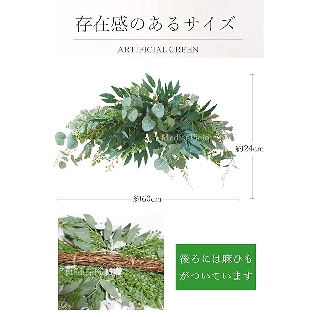 商品名:MedianField 【 ウォールグリーン 壁掛け フェイク リーフ 60cm×24cm フック付き 】 フェイクグリーン 観葉植物 造花 おしゃれ 人工観葉植物 葉っぱ 室内 大型 インテリア 装飾 アンティーク 雑貨 人工 飾り 壁掛 グリーン 緑 植物 (グリーン)