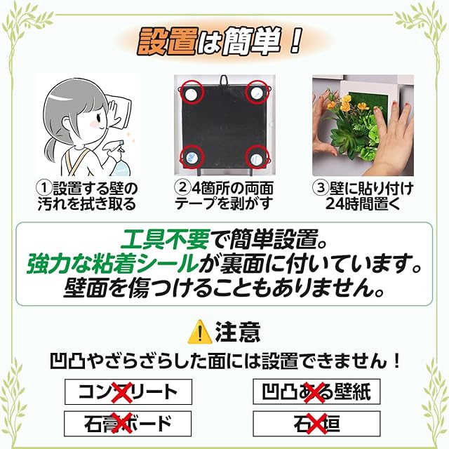 【手間いらずで美しさを保つメンテナンスフリー】 このウォールグリーンの最大の魅力は、面倒なお手入れが一切不要であることです。水やりや施肥、剪定などの手間を省き、常に美しい状態を保つことができます。土を使用しないため、虫が寄り付く心配もなく、家を清潔に保ちたい方にぴったり。さらに、外出が多くても、植物の状態を気にすることなく、四季を通じて緑を楽しむことができます。植物のメンテナンスが苦手な方や、忙しいライフスタイルの方にも最適です。