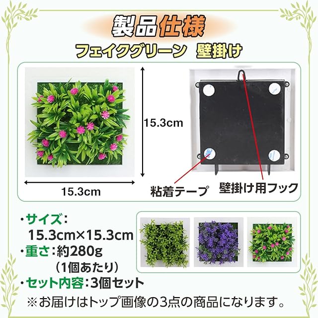<br><br>【室内空間を一変させるデザイン】 このウォールグリーンは、まるで芸術作品のように壁を彩り、空間全体にナチュラルな美しさを添えます。リビングや寝室、玄関など、どの部屋にも調和するデザインで、お部屋を簡単にグレードアップ。シンプルな壁に飾るだけで、部屋全体が明るく、居心地の良い雰囲気に変わります。6種類の異なるデザインがセットになっており、3つを並べたり、別々の場所に飾ることで、個性豊かなインテリアを楽しめます。特に、DIYインテリアや模様替えが好きな方におすすめです。<br><br>【手間いらずで美しさを保つメンテナンスフリー】 このウォールグリーンの最大の魅力は、面倒なお手入れが一切不要であることです。水やりや施肥、剪定などの手間を省き、常に美しい状態を保つことができます。土を使用しないため、虫が寄り付く心配もなく、家を清潔に保ちたい方にぴったり。さらに、外出が多くても、植物の状態を気にすることなく、四季を通じて緑を楽しむことができます。植物のメンテナンスが苦手な方や、忙しいライフスタイルの方にも最適です。<br><br>【多用途に使えるインテリアオプション】 このウォールグリーンは、家庭だけでなく、ビジネスシーンでも幅広く活用できます。オフィスやカフェ、バー、ホテルなど、様々な商業施設での使用が推奨され、空間にプロフェッショナルな雰囲気を加えます。小さなサイズのため、狭いスペースでも設置が可能。例えば、モデルルームでは、統一感のあるデザインとして複数のウォールグリーンを組み合わせることで、エレガントな空間を作り出します。インテリアの一貫性を保ちつつ、必要に応じて簡単に配置を変更することができます。<br><br>【リアルで高品質なフェイクグリーン】 最新の暗号化シミュレーション技術により、このウォールグリーンは本物のユーカリと見間違えるほどのリアリティを実現しています。葉の細部まで緻密に再現されたデザインは、触れてもフェイクとは感じさせません。鮮やかな色彩と高密度な質感が特徴で、耐久性に優れているため、長期間にわたり劣化せず、美しい外観を維持します。高品質な素材を使用しているため、フェイクでありながら自然な風合いが魅力で、どんなインテリアスタイルにもマッチします。<br><br>【環境に優しく、健康にも配慮】 このウォールグリーンは、環境に配慮した無毒・無害な素材で作られており、アレルギー体質の方やペットにも安心してご利用いただけます。花粉や異臭の原因となる成分が含まれていないため、アレルギー反応を引き起こす心配がなく、特に健康志向の方におすすめです。また、エコフレンドリーな製品であるため、環境保護にも貢献します。見た目の美しさだけでなく、安心してお使いいただけるという点でも、このウォールグリーンは最適な選択肢となります。<br><br>