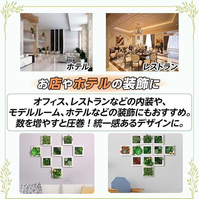 【多用途に使えるインテリアオプション】 このウォールグリーンは、家庭だけでなく、ビジネスシーンでも幅広く活用できます。オフィスやカフェ、バー、ホテルなど、様々な商業施設での使用が推奨され、空間にプロフェッショナルな雰囲気を加えます。小さなサイズのため、狭いスペースでも設置が可能。例えば、モデルルームでは、統一感のあるデザインとして複数のウォールグリーンを組み合わせることで、エレガントな空間を作り出します。インテリアの一貫性を保ちつつ、必要に応じて簡単に配置を変更することができます。