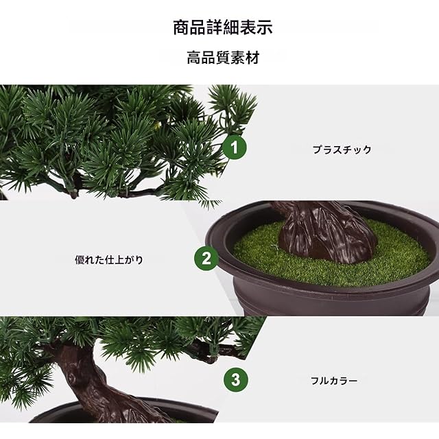 <b>パッケージリスト</b><br /> 1 x 模擬植物盆栽<br /><br /><br /><b>特徴</b><br /> - サイズ: 31.00x23.00x13.00cm/12.18x9.04x5.11 インチの人工松の装飾品。<br />- 素材: プラスチック、植毛、樹脂のグリーンオフィス装飾。<br />- 日々のメンテナンスが不要で、簡単に自然の美しさを楽しめます。必要に応じて、湿らせた布で簡単に掃除できます。ポット付きのリ な盆栽です。<br />- 人工の鉢植えは に見え、あなたの生活空間に緑の生命と新鮮さをもたらす人工観葉植物です。<br />- リビングルーム、庭、オフィスの本棚、 ェ、その他の機会の人工屋外植物の装飾に非常に適しています。<br />- 植物は好きだけど水やりをする時間がないという家族や友人への 。屋外用の人工植物。<br />- ポット付きの小さなフェイクプラントは、部屋の装飾やオフィスの装飾、デスクのフェイクプラントの装飾に欠かせないアイテムです。<br /><br /><b>商品情報</b><br /> 人工盆栽ジュニパーの木 これは非常に実用的なシミュレーション鉢植え植物で、あなたの良い装飾の選択になります。屋外の卓上装飾この製品は、装飾によく適用できるポット付きの人工緑植物盆栽です。家庭、オフィス、店舗、その他の場所の
