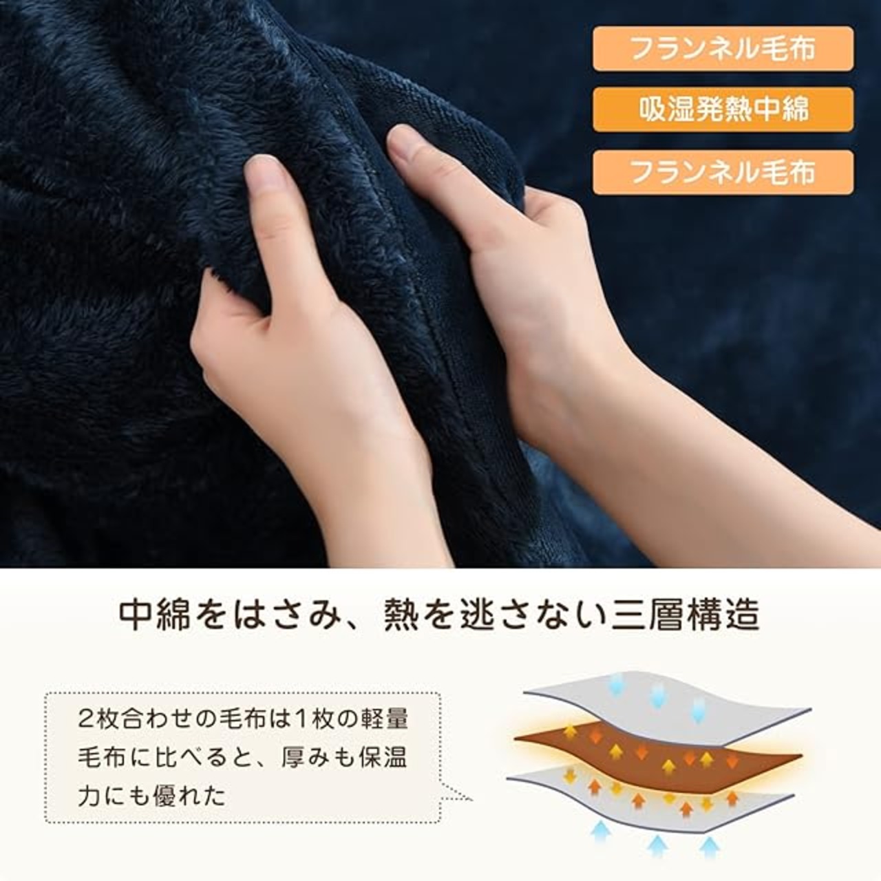 商品名:クモリ(Kumori) あったか毛布 二枚合わせ 掛け毛布 厚手 真冬もうふ ふわふわ フランネル ブランケット 吸湿発熱 静電防止 襟付き 丸洗いOK (ネイビー シングル・140X200cm)
