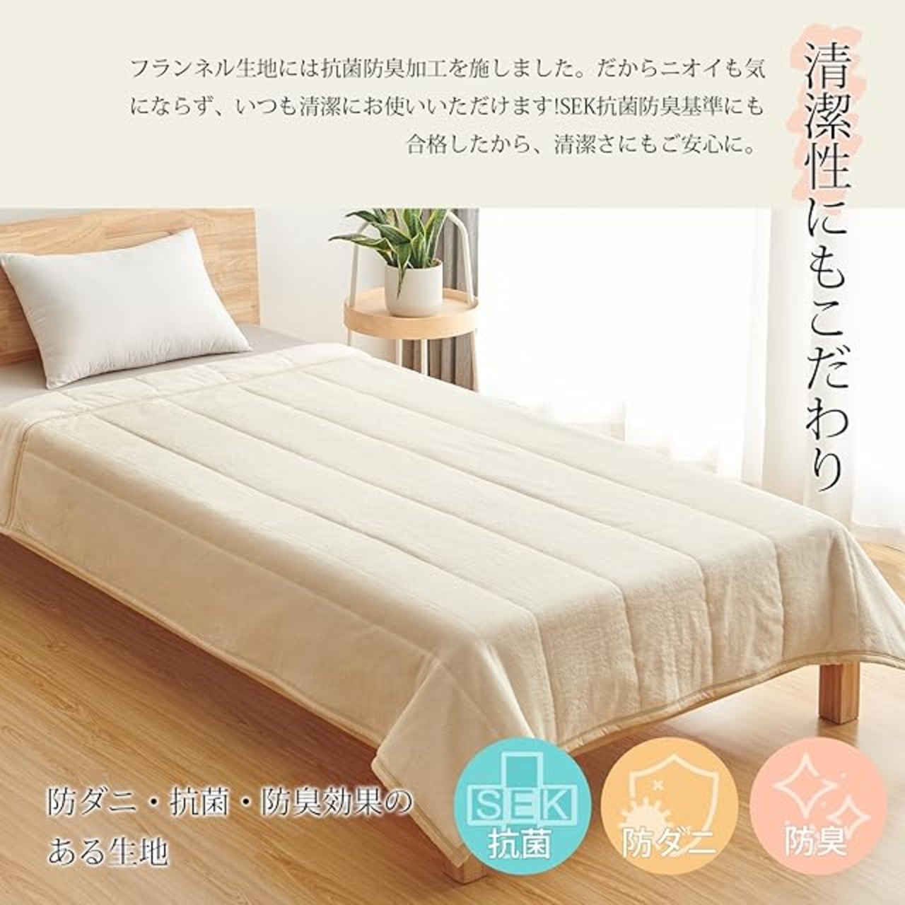 【静電気防止·毛布】 静電気防止の加工を施しているので、空気が乾燥している秋冬にも、安心にお使いいただく。また、二重に縫製しているキルトがはずれにくく、何度洗濯しても型崩れしない。