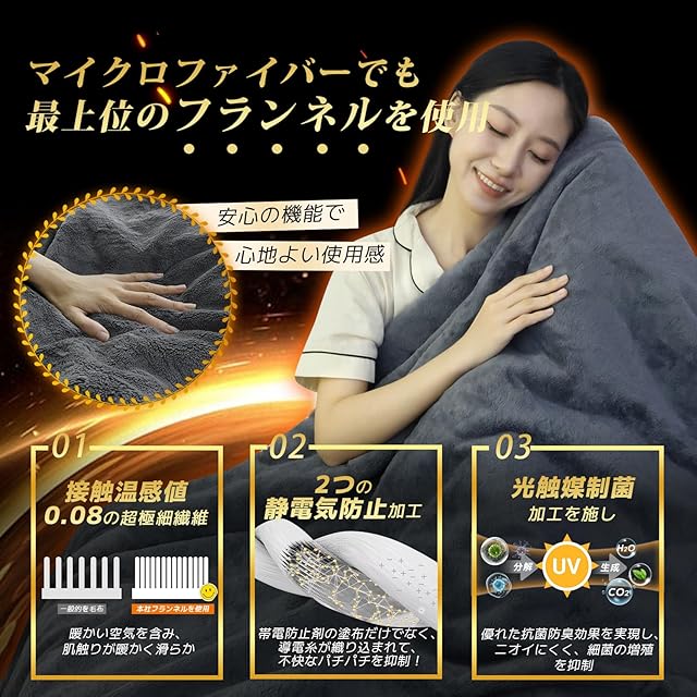 【接触温感・ダブル静電気防止効果】毛布の表裏地には、接触温感値0.08の「フランネル扁平糸」超極細繊維が使用されて、手触りが暖かく滑らかで、8mmの毛足によりたくさん暖かい空気を含み、温かい空気層を形成します。5cmごとに導電糸が生地に織り込まれて、静電気を効果的に除去します。さらに帯電防止剤加工が施されているため、ダブル静電気防止効果になり、乾燥した季節でも嫌いなパチパチから解放され、安心できます。