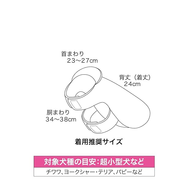 首まわり:約23〜27cm 胴まわり:約34〜38cm 着丈:約24cm。チワワ、ヨークシャー・テリア、パピーなど超小型犬向き。