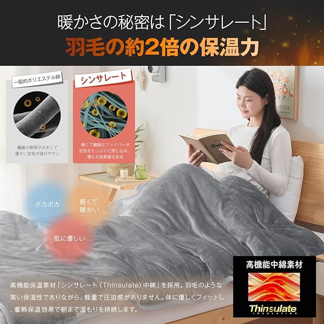 ✨【温かさの秘密:シンサレート中綿】毛布の中綿には、空気を多く含み熱を逃がしにくい特性を持つシンサレート中綿を使用しています。シンサレートの高機能中綿素材には、羽毛の先とほぼ同じ細さのマイクロファイバーが使われており、複雑に絡み合った微細な繊維の間に大量の空気を閉じ込めることが可能です。そのため、冷えやすい朝や寒い夜でも、長時間にわたって快適な温かさを保ちます。