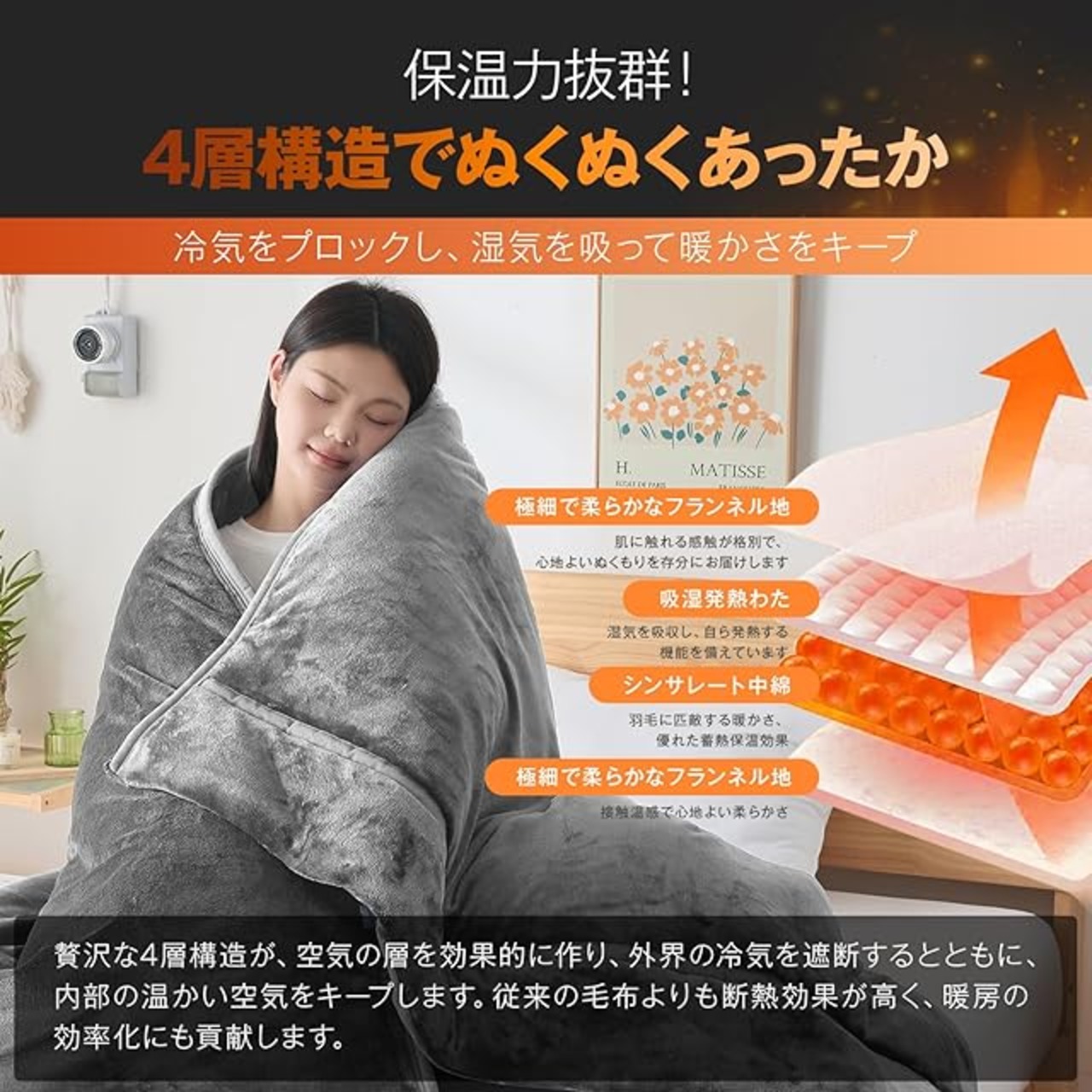 ✨【四層構造・静電気防止】表側と裏側にふんわり柔らかいフランネル生地を採用し、中間には保温性に優れた蓄熱綿と、軽くて薄いシンサレート中綿を充填した四層構造で、抜群の温かさを実感いただけます。さらに、毛布の表地部分には静電気抑制効果のある特殊な糸を使用しており、冬に気になるパチパチとした静電気を最大限抑制します。※ご注意:静電気の発生を抑制する加工であり、完全に除去できるものではございません。