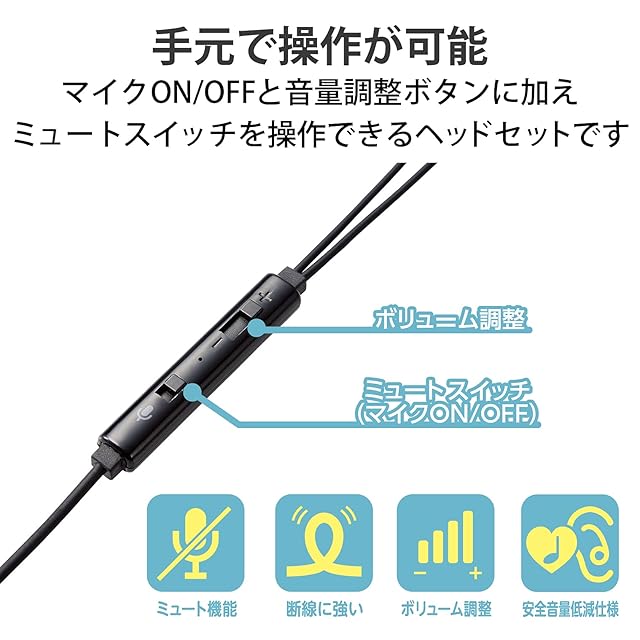 オンライン学習に最適。コンパクトに収納や持ち歩きができるイヤホンタイプで、手元でマイクのON/OFFが可能なミュートスイッチ搭載のステレオ耳栓タイプのマイク付き4極φ3.5mmイヤホン。音が大きくなりすぎない低音量仕様(85dB)で子どもの耳を守ります。