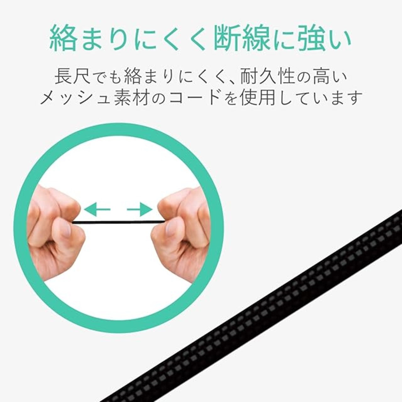 長尺でも絡まりづらく、耐久性が高く断線に強いナイロンメッシュ素材のコードを採用しています。