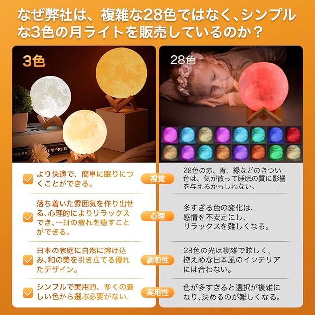 【2023.6.16から進化版・2色を3色に変更】昼白色・温白色・電球色・3色をゆっくり点滅、四つのモードある。暗闇の中でもっと月のような光がよく見える。(外光が強い場合はあまり目立たない場合があります)。充電中に、電流は0.2Aのみ(人体が耐えられる安全な電流レベルをはるかに下回るものです),スイッチのボタンをタッチして絶対に安全です。心配しないでください。
