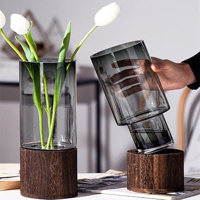 花瓶 ガラス 木製 フラワーベース 北欧 おしゃれ 花器 透明 ブラック グレー 大きい 花びん シンプル 高さ25cm 30cm 北欧 インテリア リビング 寝室オフィス (高さ:26cm)