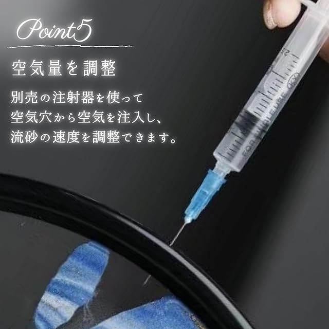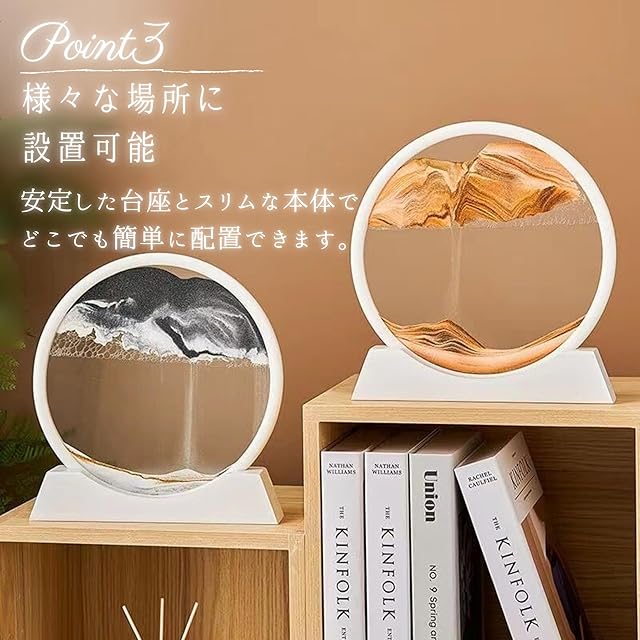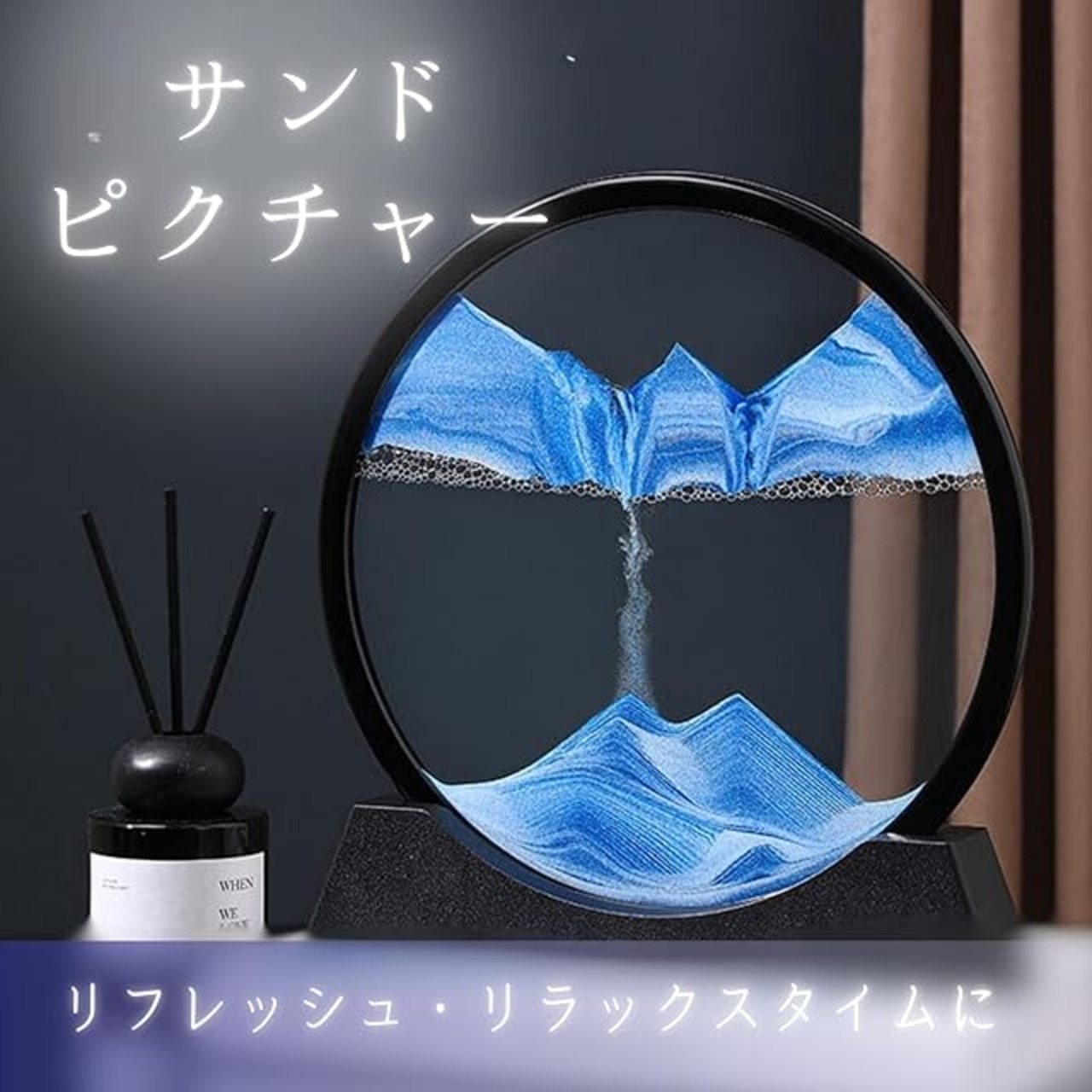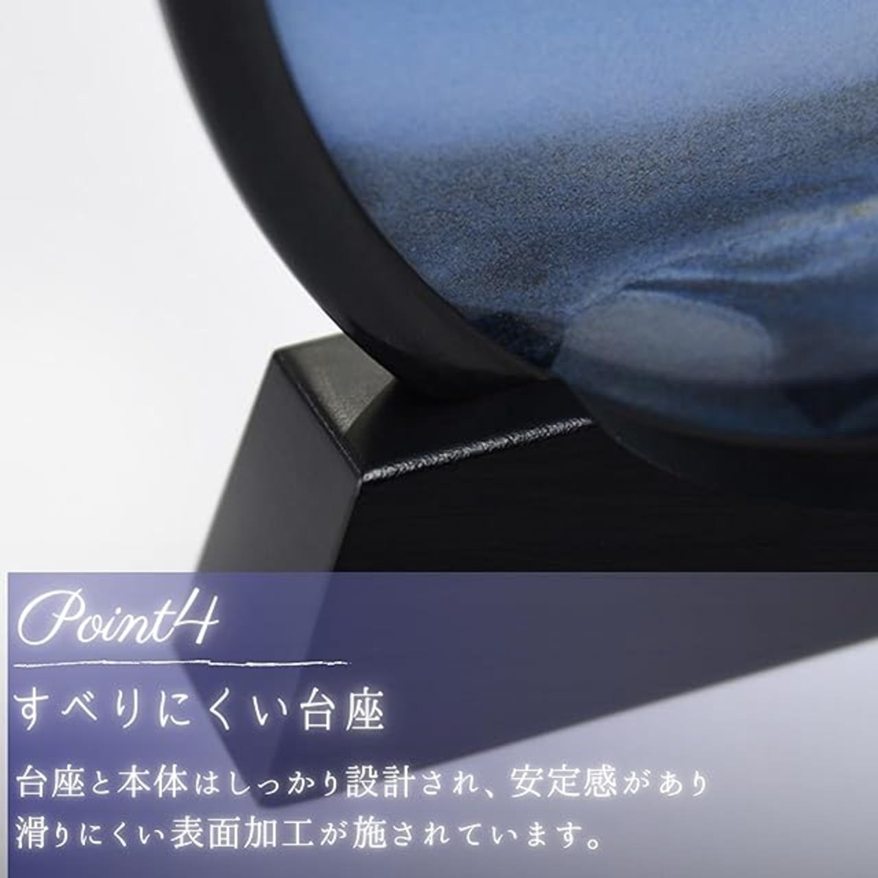 【特徴・特長】 毎回異なる砂の流れが新しい模様を生み出し、飽きることなく楽しめます。360度回転可能なデザインで、さまざまな角度から観賞可能。