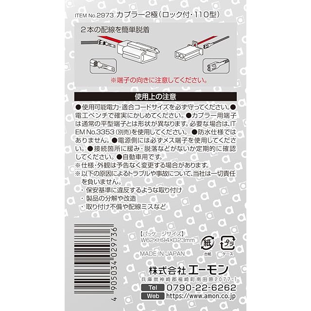 商品名:エーモン(amon) カプラー2極 (ロック付) 110型 3セット適合コードサイズ AV(S)0.5∼1.25sq 2973