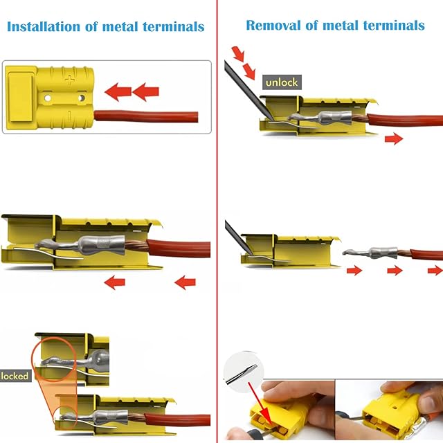♦使いやすさ:バッテリーケーブルを端子ピンに挿入し、はんだ付けまたは圧着します。 バッテリーディスコネクトをプラグの後ろにスライドさせて、所定の位置にロックします