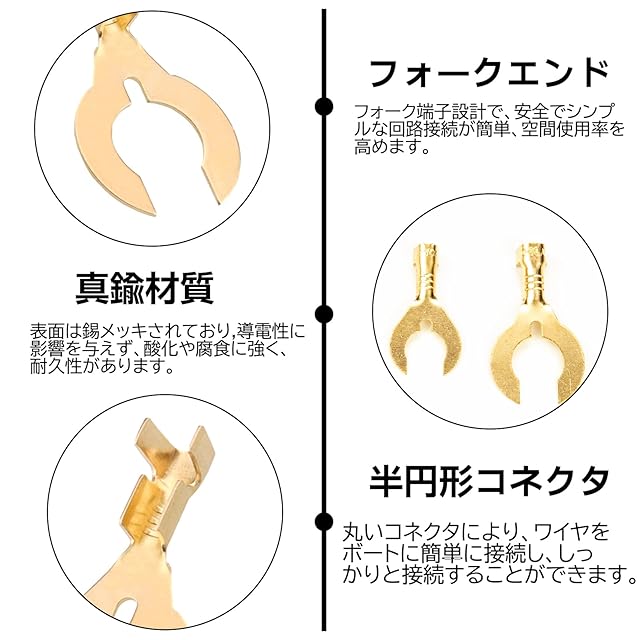 【素材】クワ型端子は高品質の真鍮で作られています。導電性、耐久性に優れた圧着端子です。