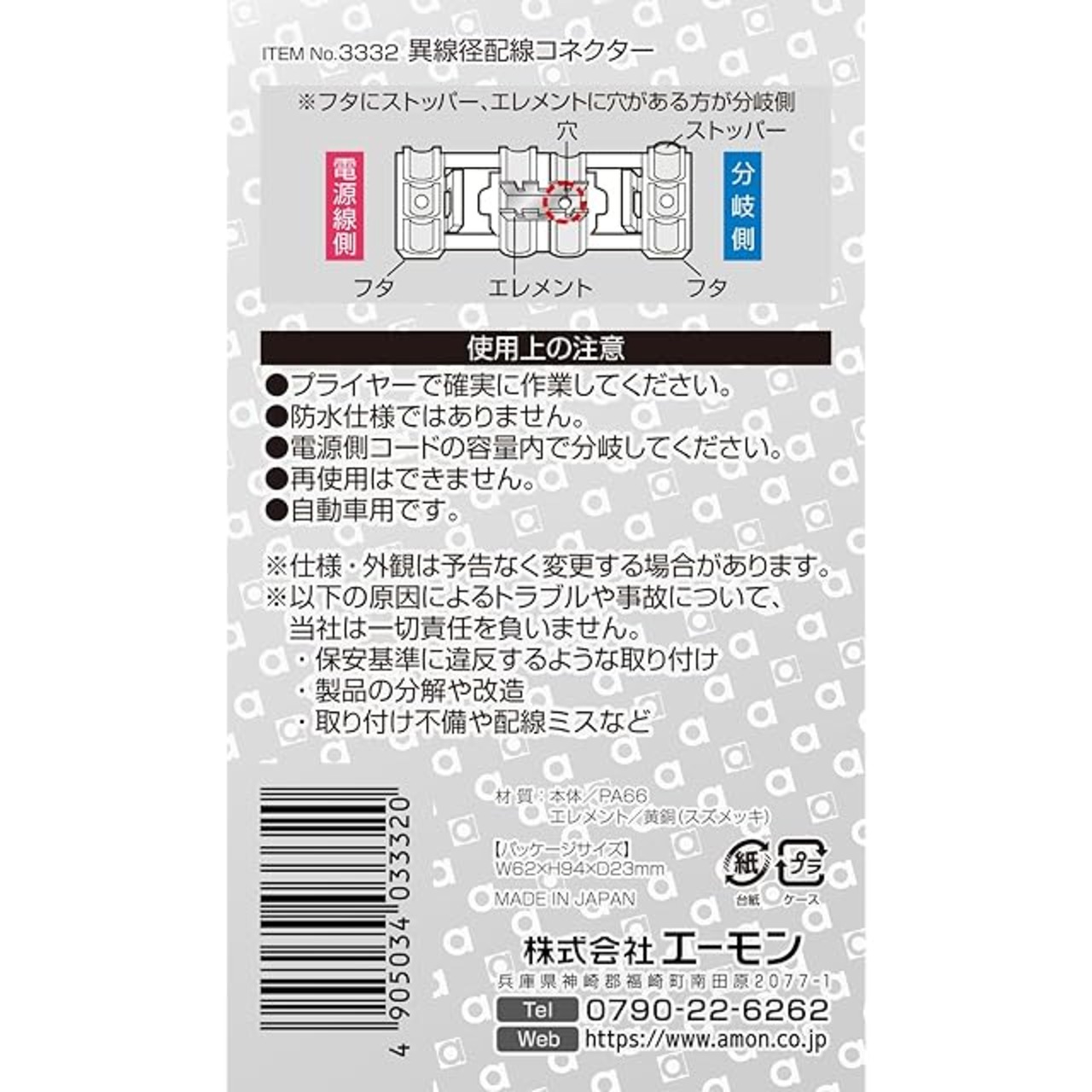 商品名:エーモン(amon) 異線径配線コネクター 白 電源側AV(S)0.5~0.85sq/分岐側AV(S)0.2~0.5sq 4個入 電装品の取り付け 太いコードから細いコードを分岐 接続 コードの切断や被覆剥き不要 3332