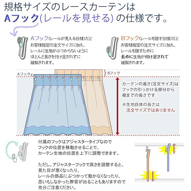 フック:アジャスターAフック(レールを見せる)つき⇒上部にレールを隠すための生地はほとんどついていません(約1cmのみ)。レールの下にぶら下がり、見せるように掛かります。■このサイズには製法上巾継ぎが入ります。巾200cm1枚に付き1か所の継ぎ目となります。ご了承の上ご注文下さい。