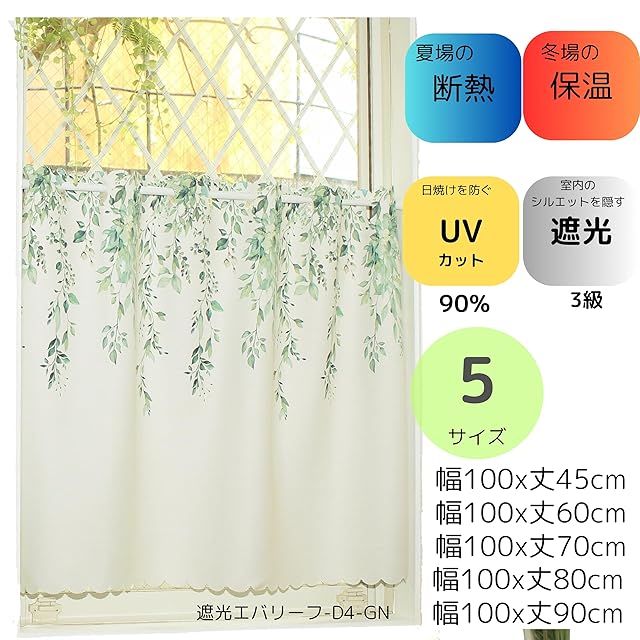 商品名:【cloth shop 布や】 カフェカーテン 小窓用 遮熱 断熱 【グリーン [エバリーフ ・遮光] 幅100cm x 丈70cm [1枚入]】