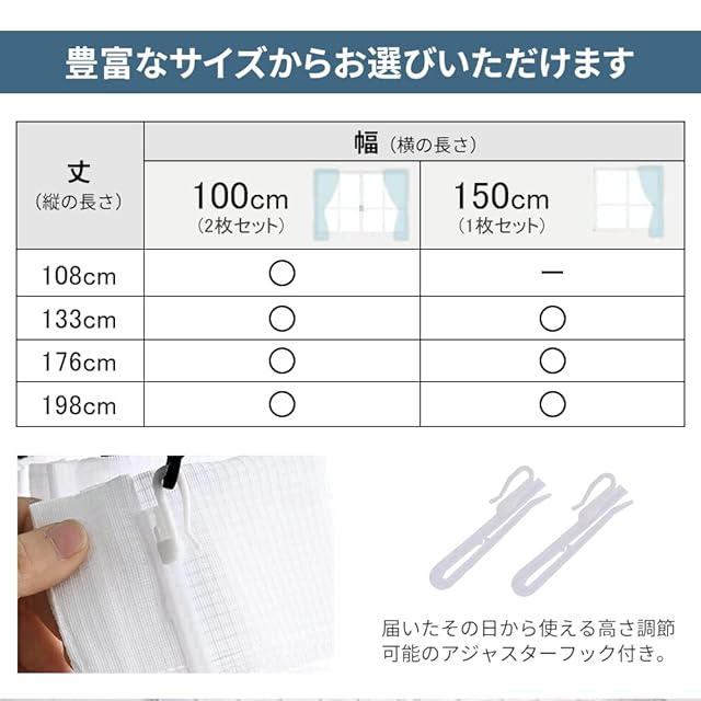 【商品名】:レースカーテン 【幅】:100cm、150cm 【サイズ】:100x108cm、100x133cm、100x176cm、100x198cm色んなサイズ対応。 【素材】 ポリエステル100% 【特徴】: 1 外から見えにくい レースカーテンは外から見えにくいプライバシーを守ります。 2 UVカット:紫外線からお肌や家具の日焼けを防止します。 3 省エネルギー:断熱保温、冷暖房の効率を高めエネルギーをはぶきます。 4 アジャスターフックあり、いろいろなカーテン対応できます。 【お手入れ方法】:洗濯機使用可能 【季節】:春 夏 秋 冬 オールシーズン 【生産地】:中国産 キーワード: