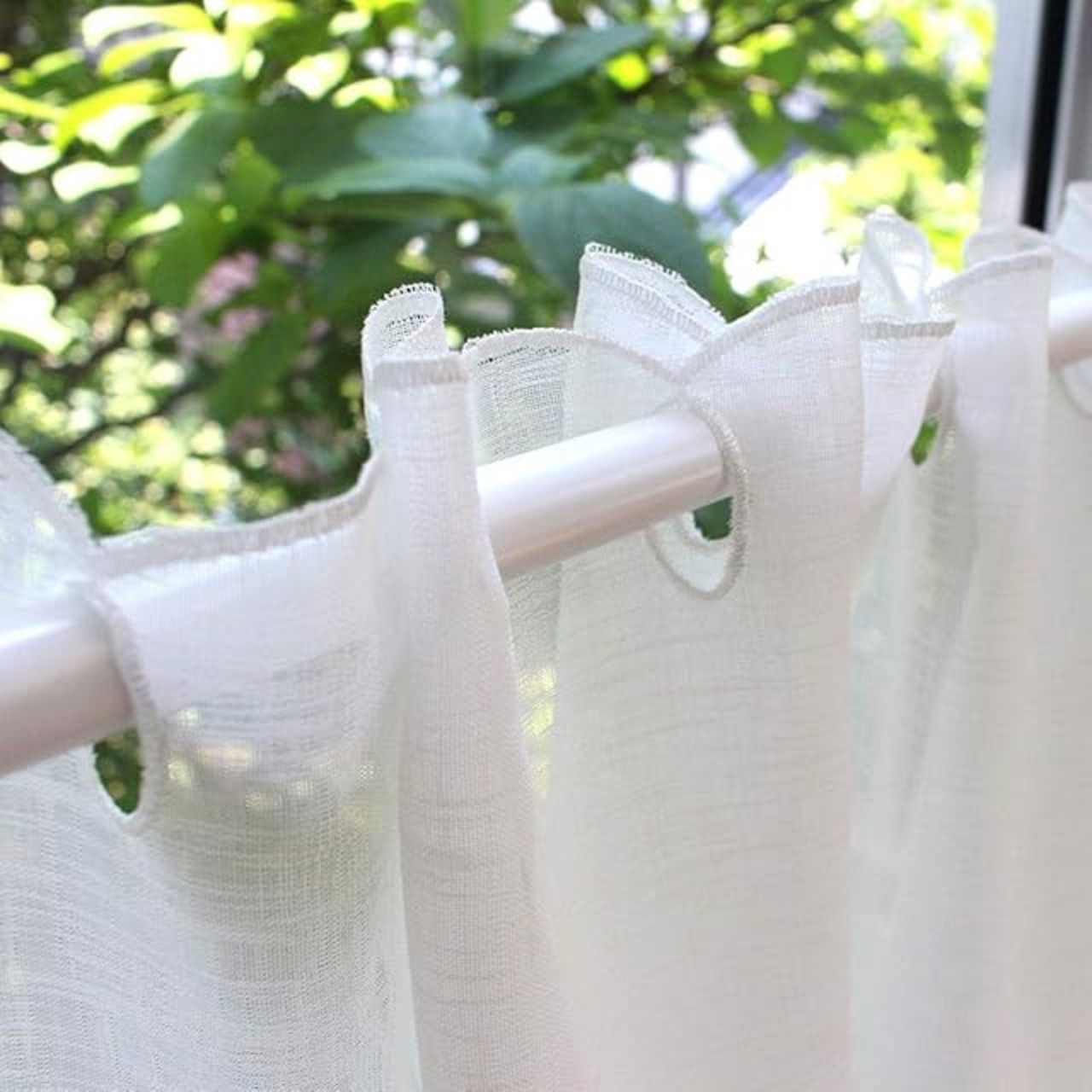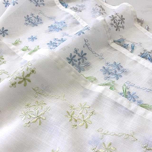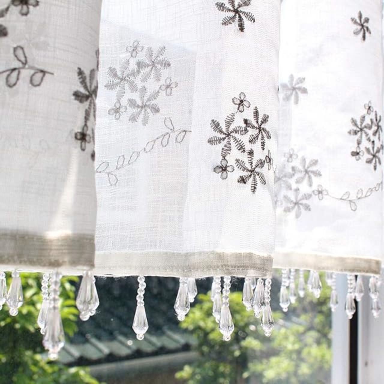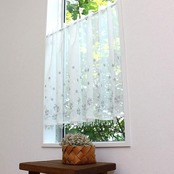 【デザイン】可愛い小花の刺繍が素敵なカフェカーテン。風に揺れる裾のビーズと程よい透け感のあるスラブ生地はとてもさわやかな印象です。