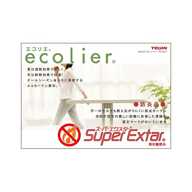 断熱素材配合糸「エコリエ」・素材難燃糸「スーパーエクスター」使用。防炎加工つき(防炎ネームタグ縫付)。生地の厚みで冷暖房効果アップとプライバシー保護・夜電気をつけても外から見えにくい。※お部屋の中からも外が見えにくくなりますので、ご注意下さい。