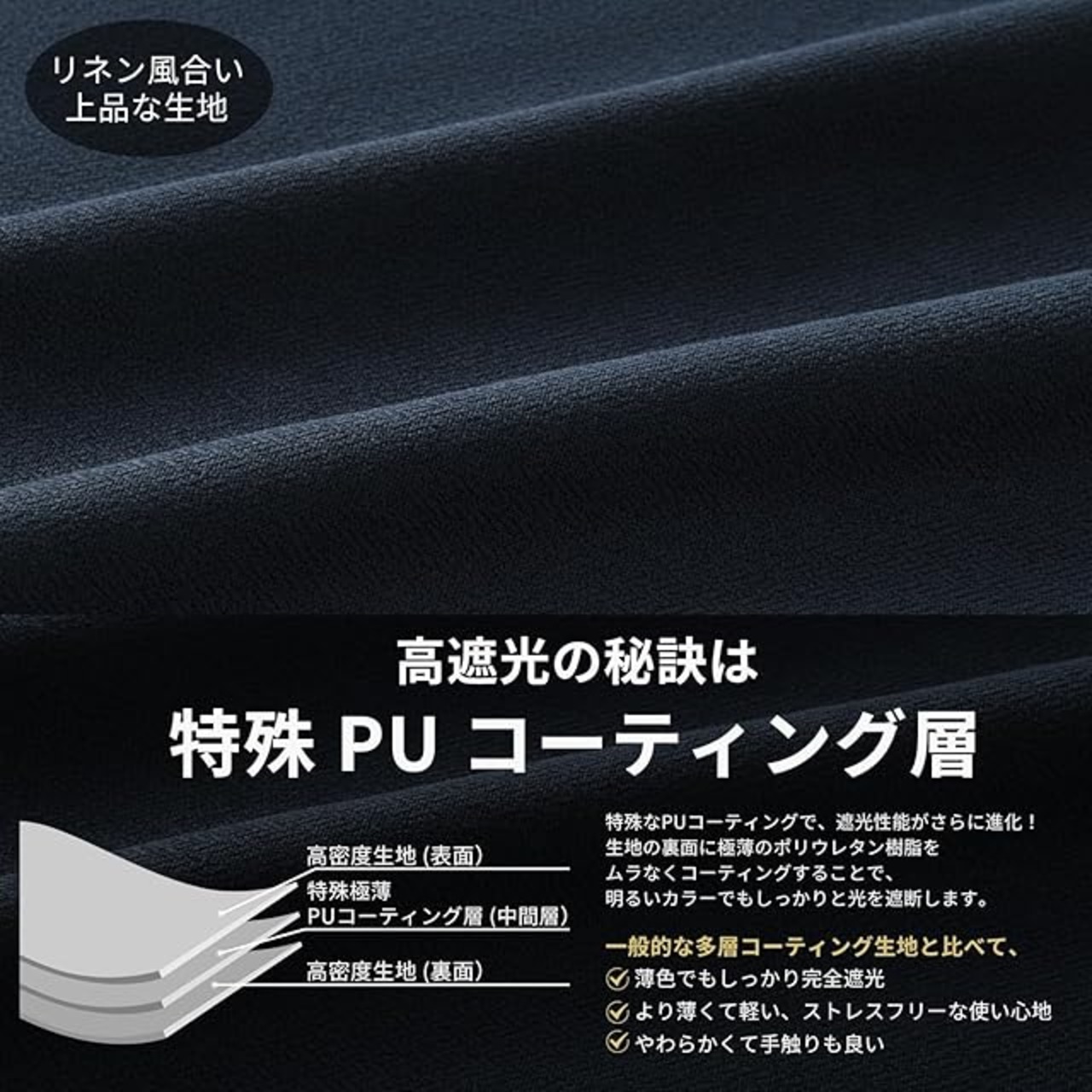 【三層構造】当社独自の特殊PUコーティングを採用した三層構造により、しなやかでソフトな質感を保ちながら、100%完全遮光を実現しました。特に薄い色でもしっかりと外光を遮る高い遮光性を持ち、機能性とデザイン性を両立しています。極薄のPUコーティング層を高密度ドレープ生地で挟み込むことで、従来の分厚くて硬い多層コーティングカーテンに比べて大幅に軽量化され、柔らかさや扱いやすさ、耐久性が向上しています。軽くて扱いやすく、取り付けもラクラク。女性の方やお一人でも手軽に着脱・お手入れが可能です。見た目もすっきり美しく、日々の暮らしに寄り添う高機能カーテンです。