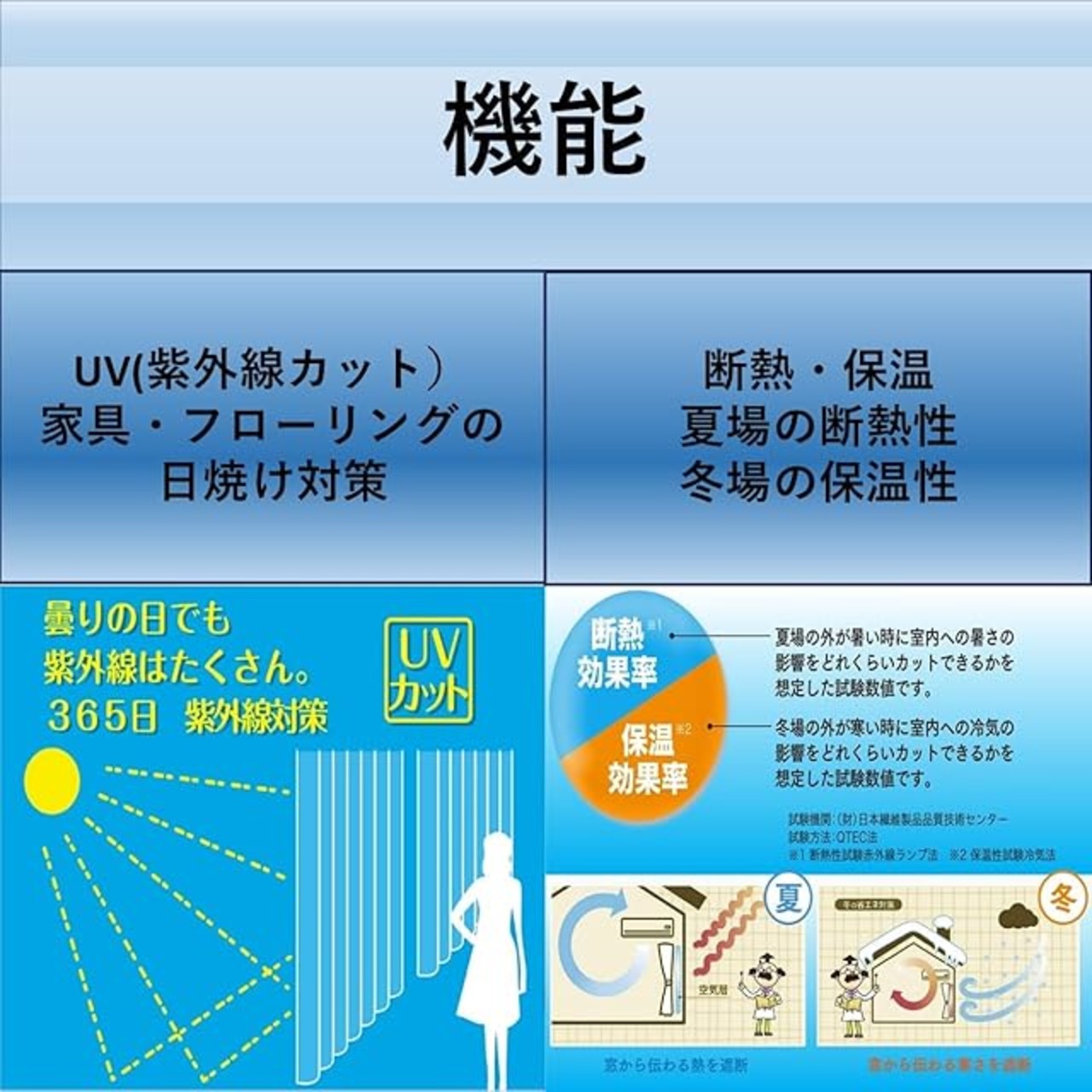 【生地特徴】UVカット86.1%、遮像性(昼)5.0級、遮像性(夜)4.5級、断熱性26.5%、保温性29.6%(日本繊維製品品質技術センター調べ)。洗濯可能。洗濯ネットに入れて弱水流で洗ってください。乾燥機、アイロン等の高温により縮む事がございますのでご注意ください。