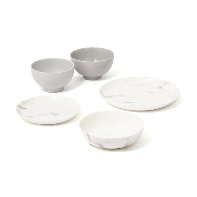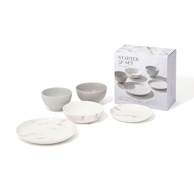 人気のオルディシリーズにマーブル柄が登場。<br/>ひとり暮らしのスタートにぜひおすすめしたい、お買い得な食器5点セットです。<br/>和食・洋食・中華などメニューを問わず使えて、お料理好きな方も満足できる充実のセット内容はそのまま、大理石柄と無地の食器がセットになったこのセットならたちまちおしゃれな食卓が完成します。<br/>朝ごはんから夕食までこの1セットですべてまかなえるよう、茶碗、汁椀、プレートM、プレートS、ボウルS、各1点をオリジナルデザインのボックスにセットしました。<br/>マーブル柄はグレーとベージュの2色展開。シーンを選ばず使えて、食器が増えても合わせやすいシンプルなデザインは、本物の大理石らしさを表現するため色によって柄を少しずつ調整しているこだわりのアイテムです。<br/>電子レンジや食器洗浄機もOKだから気兼ねなく普段使いできます。<br/>(※汁椀は電子レンジご利用いただけません)<br/>人気の「オルディシリーズ」では、一人暮らしの方からファミリーまで様々なライフスタイルに適した幅広いアイテムを取り揃えています。<br/>日々の食卓をちょっぴり豊かにしてくれるタイムレスな一枚をぜひ見つけてください。<br/>【セット内容】<br/>・茶碗×1<br/>・汁椀(樹脂製)×1<br/>・プレートM×1<br/>・プレートS×1<br/>・ボウルS×1<br/>【注意事項】<br/>電子レンジ:可(汁椀のみ不可)<br/>オーブン:不可<br/>食器洗浄機:可<br/>耐熱温度:90℃(汁椀のみ)<br/>汁椀は冷凍庫、塩素系漂白剤、煮沸消毒、クレンザーの使用はお避けください。<br/>原産国:中国