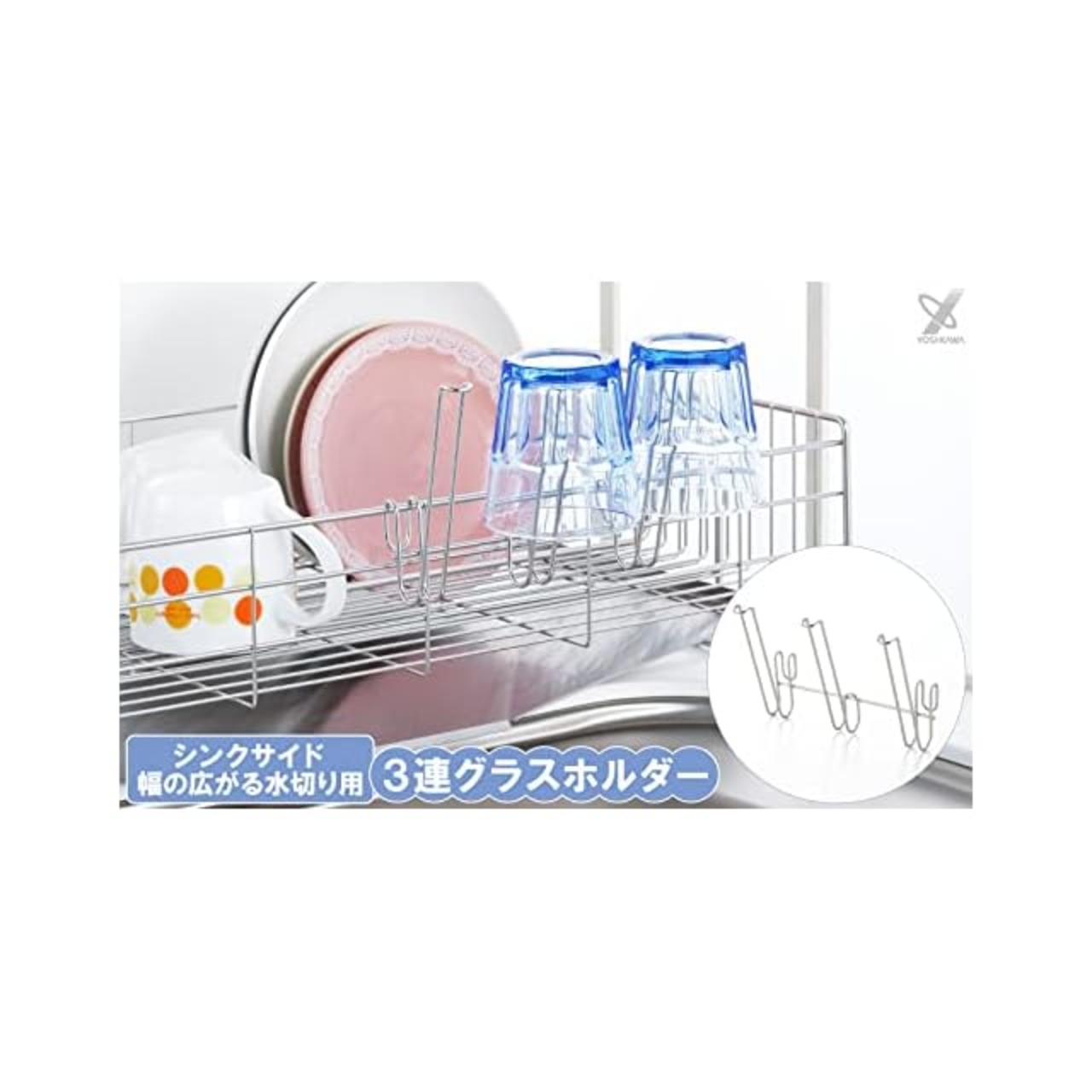 商品名:ヨシカワ グラスホルダー 水切りラック コップ 水切りかご 日本製 食器 シンクサイド 幅の広がる 3連 1305940