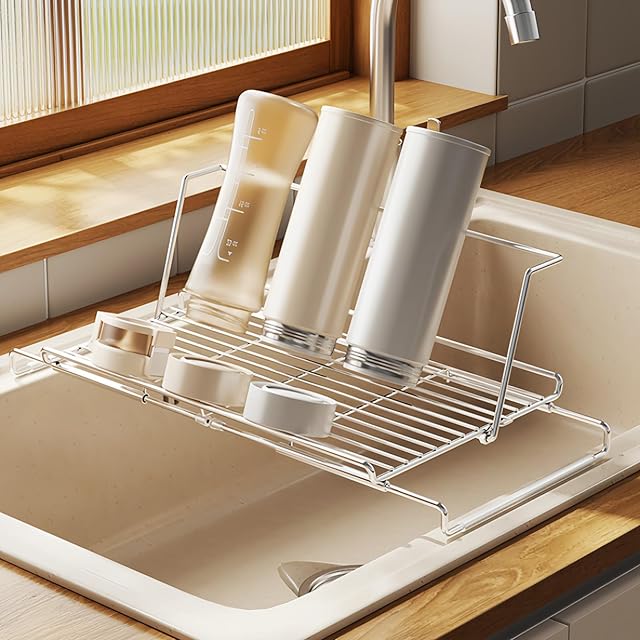 商品名:水切りラック シンク上/横 2way 食洗機対応 伸縮式 ステンレス 水切りかご 水切り収納棚 水筒 コップ水切り収納 折り畳み背板 滑り止め付き カップホルダー 省スペース キッチン収納 食器 キッチンラック 水筒立て 乾かせる 収納ラック (B)