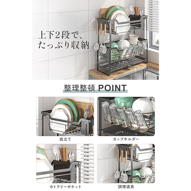 商品名:【自動排水×超スリム設計】 水切りラック [どんなシンクにも対応] 水はけスムーズ キッチン収納 洗い物がラクに! 箸立て コップ立て 皿立て スリムでもしっかり大容量 2層タイプ(ブラック)