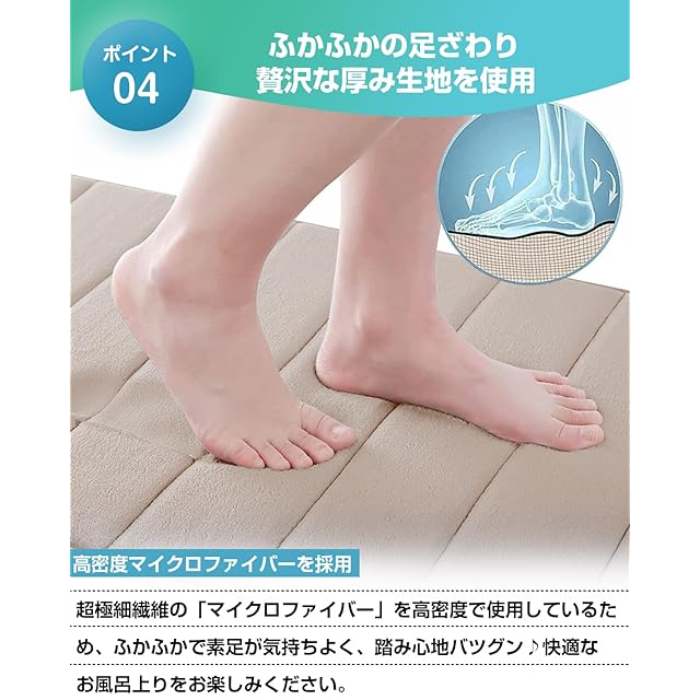 【シンプルデザインて場所を選ばない】機能性や肌ざわりも抜群なのでいろいろな場面で大活躍してくれます。滑りやすい水回りはもちるんですが、人の出入りの多い玄関やリビングのアクセントマットとして、日常のあらゆるシーンでご利用いただけます。対応場所は多く:玄関、廊下、洗面台、寝室、ダイニングルーム、浴室、バスルーム、キッチンなどです。