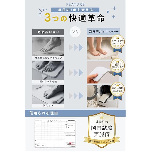 【国内吸水試験実施済】 国内検査機関にて滴下法とバイレック法の試験検査を実施。繊維製品の10倍のスピードで乾く吸水性が証明されており、いつでもサラサラな状態で使用することが出来ます。 【吸い込まれるような踏み心地】踏み心地を追求し、発砲ゴムを採用しました。発砲ゴムは天然ゴムと違い、柔軟なクッション性などの特性を持っている為、踏み心地が良くお風呂上がりが快適になるクセになるクッション性を実現しました。 【まるっと洗える】洗濯機で洗うことが出来ます。目安として週1回洗った場合、3年~4年使える耐久性を持ちます。。ポリエステル素材なので耐久性が高く変形することがありません。※乾燥機の使用は変形、色落ちする可能性があります。 【カラーとサイズ】浴室を落ち着いた雰囲気にするアイボリー、汚れが目立ちにくくスタイリッシュな外観を演出するグレー、2種類のカラーを採用しました。サイズは一般的な浴槽に合わせて縦40㎝、横60㎝、厚み3.5㎜となっています。 【注意事項】洗って干す際には日光に当たると色落ちする可能性がありますので、陰干しすることをオススメします。
