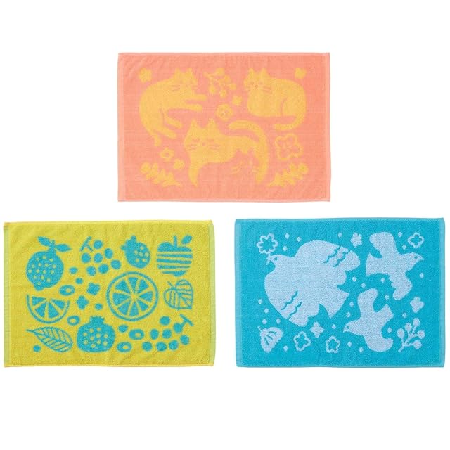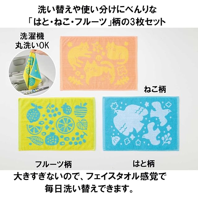 【サイズ】35×50㎝ 重量 95g(1枚あたり)【材質】綿100%【セット内容】はと柄 1枚/ねこ柄 1枚/フルーツ柄 1枚【生産国】中国