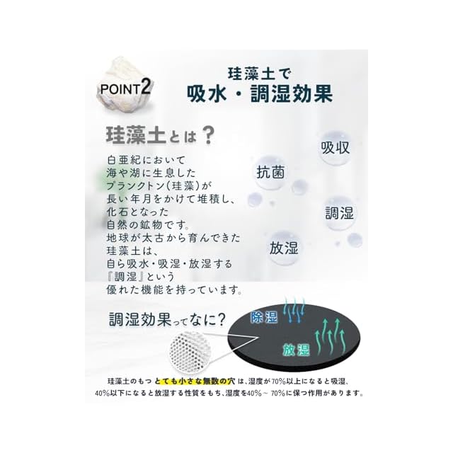 【珪藻土配合】吸水・吸湿・放湿する『調湿』という優れた機能を持っています。 珪藻土は、植物性プランクトンの化石を原料としており、無数の小さな穴があります。 これによって、高い吸水性と速乾性を兼ね備えています。