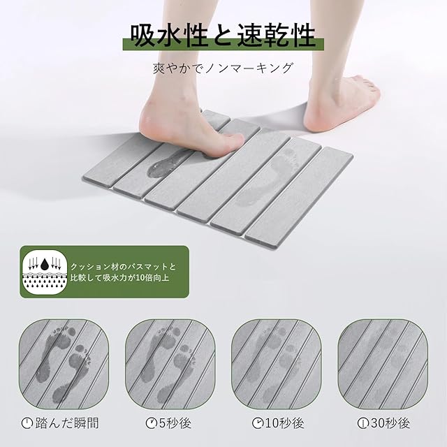 『通常のバスマットと珪藻土バスマットの違い』通常のバスマットは、気を付けて使わないとビショビショになってしまうことがありますが、珪藻土バスマットは水に濡れてもすぐに乾きます。体を拭かないままバスマットに乗っても、珪藻土バスマットならすぐにサラサラの使い心地の表面に戻ります。