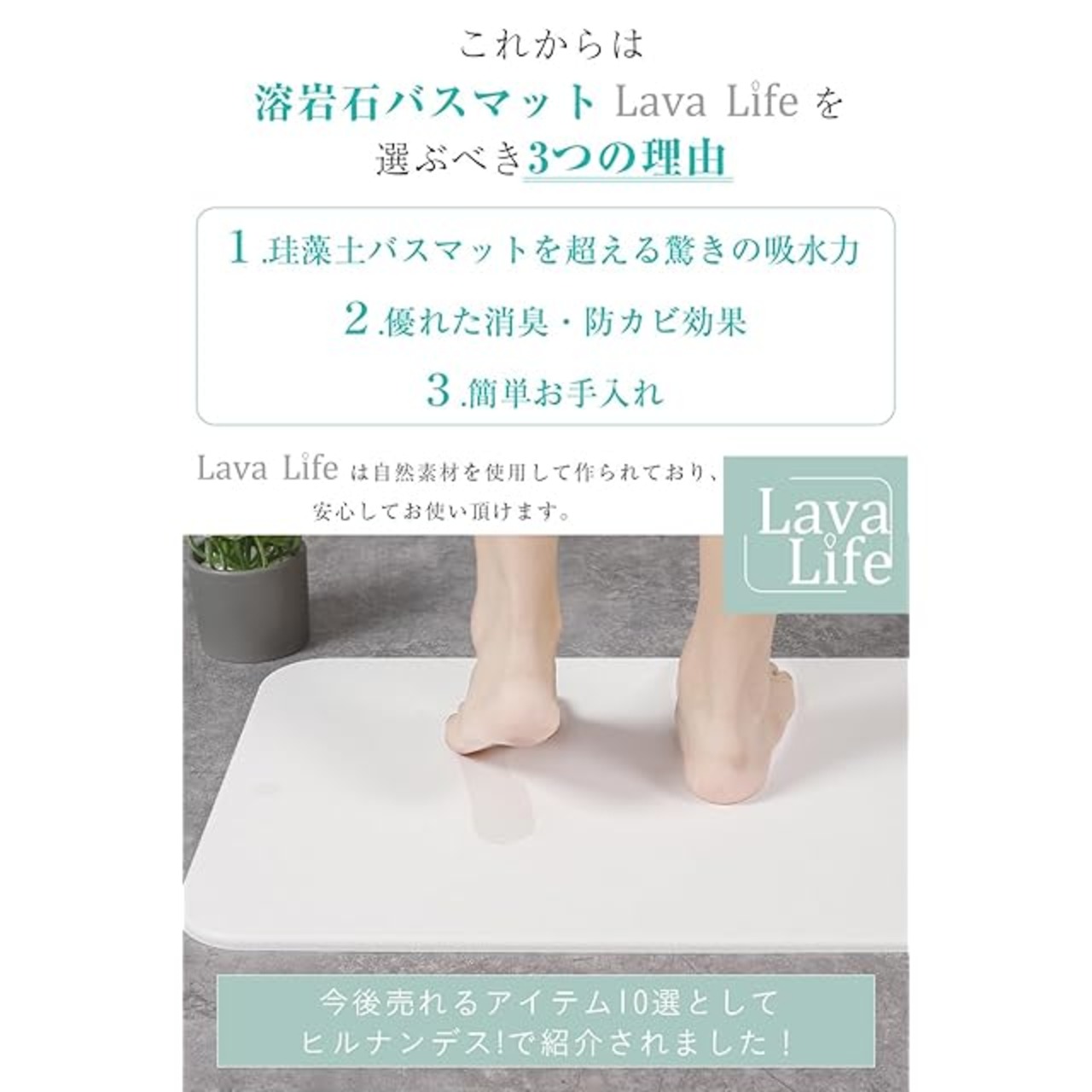 ✅バスマットは次の時代へ。Lava Lifeは次世代の素材”溶岩石(火山岩)”を使ったバスマットです。表面には小さな穴が無数空いており、水分の吸収や放出、消臭の機能に優れています。