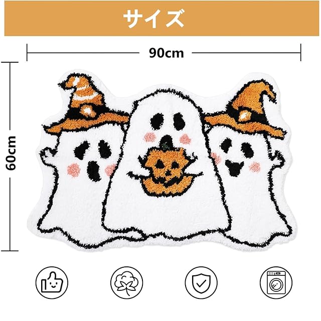 「季節感たっぷりのハロウィンデザイン」:可愛い幽霊柄が印象的で、バスルームやトイレ、キッチンなどに置くだけでハロウィンの雰囲気がぐっと高まります。お子様や来客にも好評のデザインです。